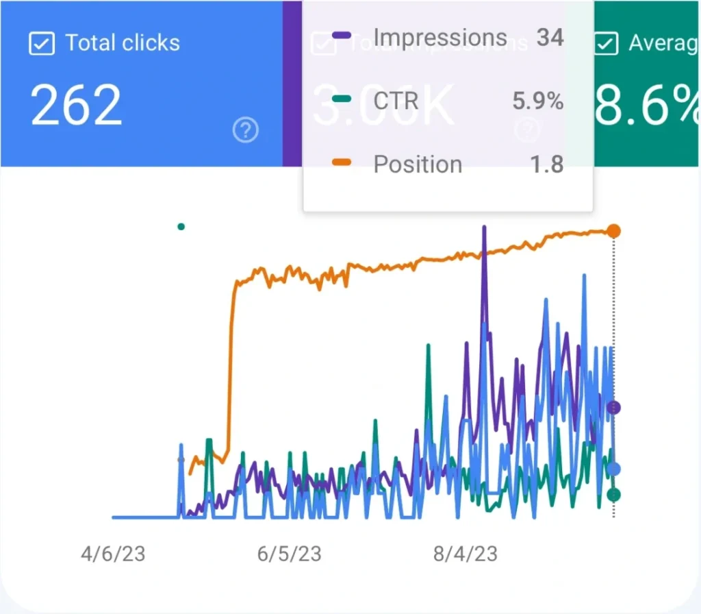 Iz grafova je vidljivo eksponencijalno povećanje broja impresija, klikova i pozicija za relevantne ključne riječi u periodu od 6 mjeseci. Drugim riječima, povećan je broj organskog prometa (posjeta na web), posljedično i konverzija, odosno profita.